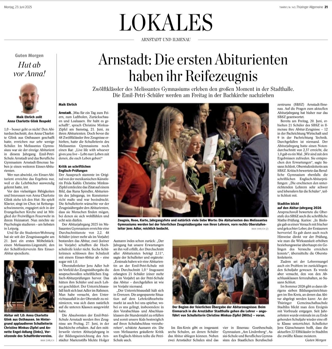 Toller Artikel zur Abitur-Zeugnisausgabe in der Thüringer Allgemeinen vom 23.06.2025.