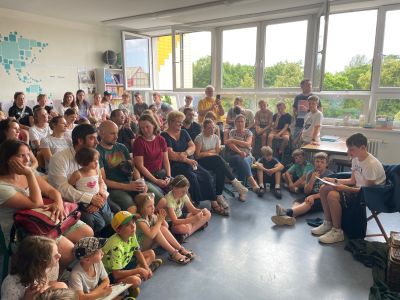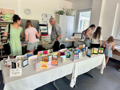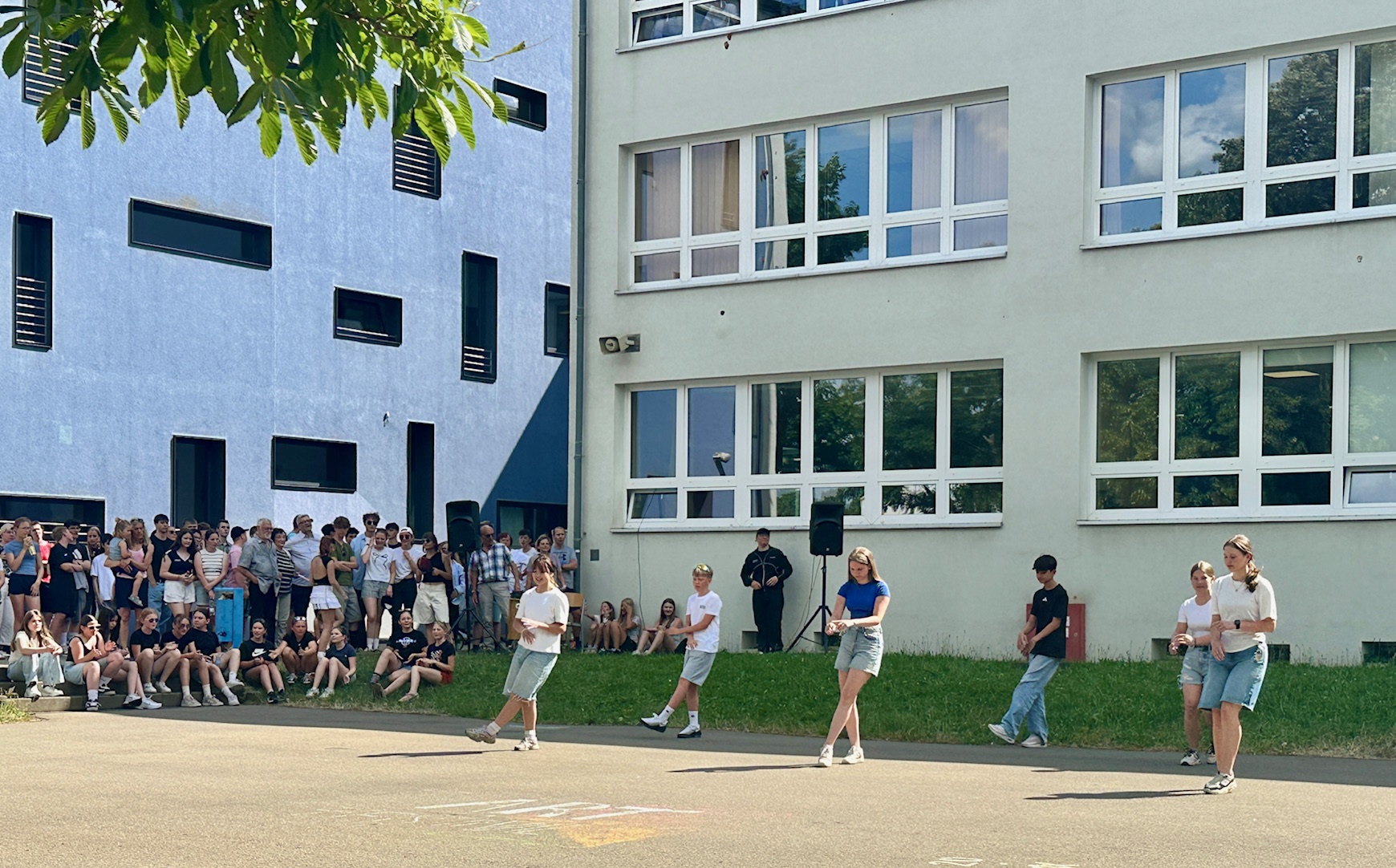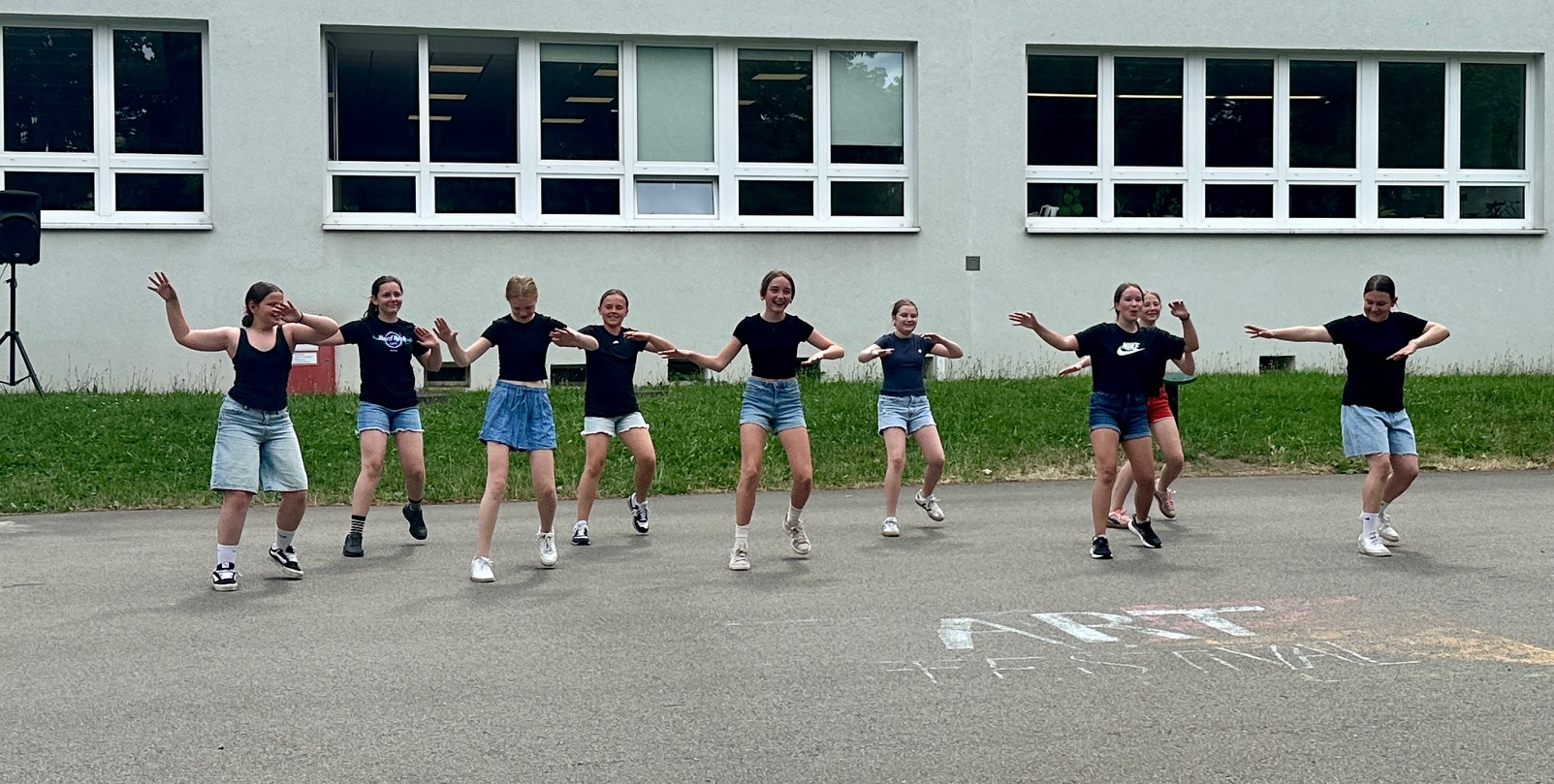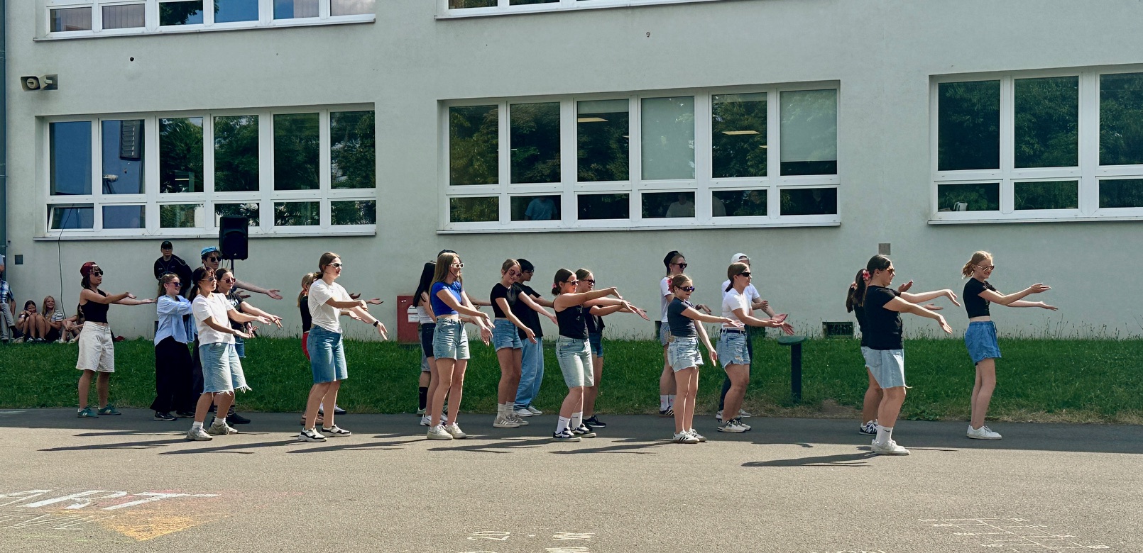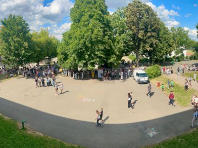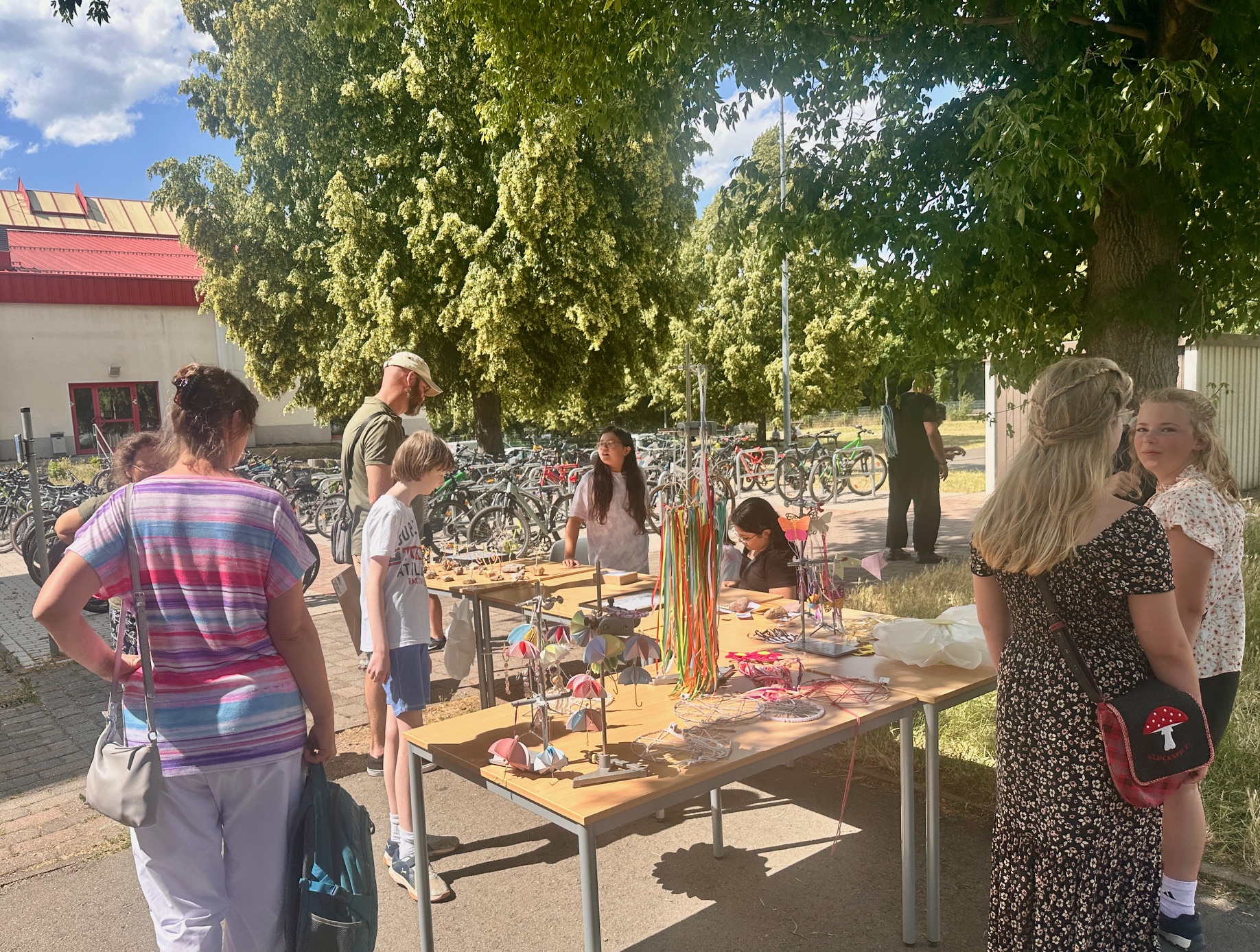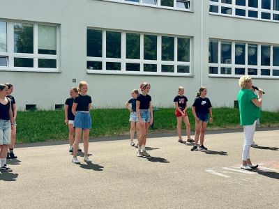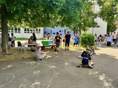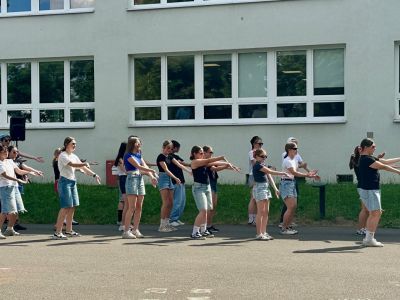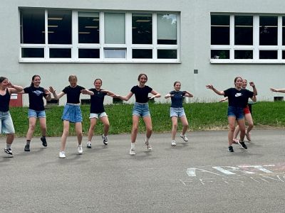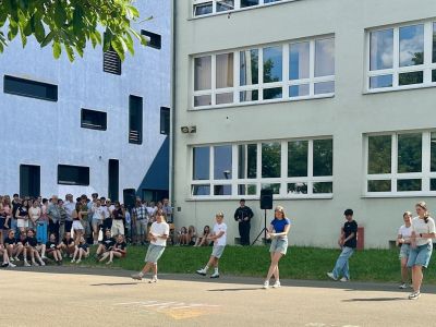 Am Donnerstagnachmittag, dem 26.06.2025 war dann der krönende Abschluss der Projektwoche: das Schulfest. Das Wetter war uns fast die ganze Zeit hold und so wurde der Schulhof zum Treffpunkt für die ganze Schulgemeinschaft. Es gab eine Zumba-Performance, die richtig Stimmung machte, gefolgt von zwei Mitmach-Tanzrunden, bei denen viele Schülerinnen und Schüler spontan mit einstiegen. In der Turnhalle zeigten die Akrobatik-Gruppen ihr Können, es wurden eigene Sagen vorgelesen, und in vielen weiteren Ständen und Räumen im Schulhaus konnte man alle Ergebnisse der Projektwoche bestaunen – von Kunstwerken über Informationsstände bis hin zu kreativen Handarbeiten.