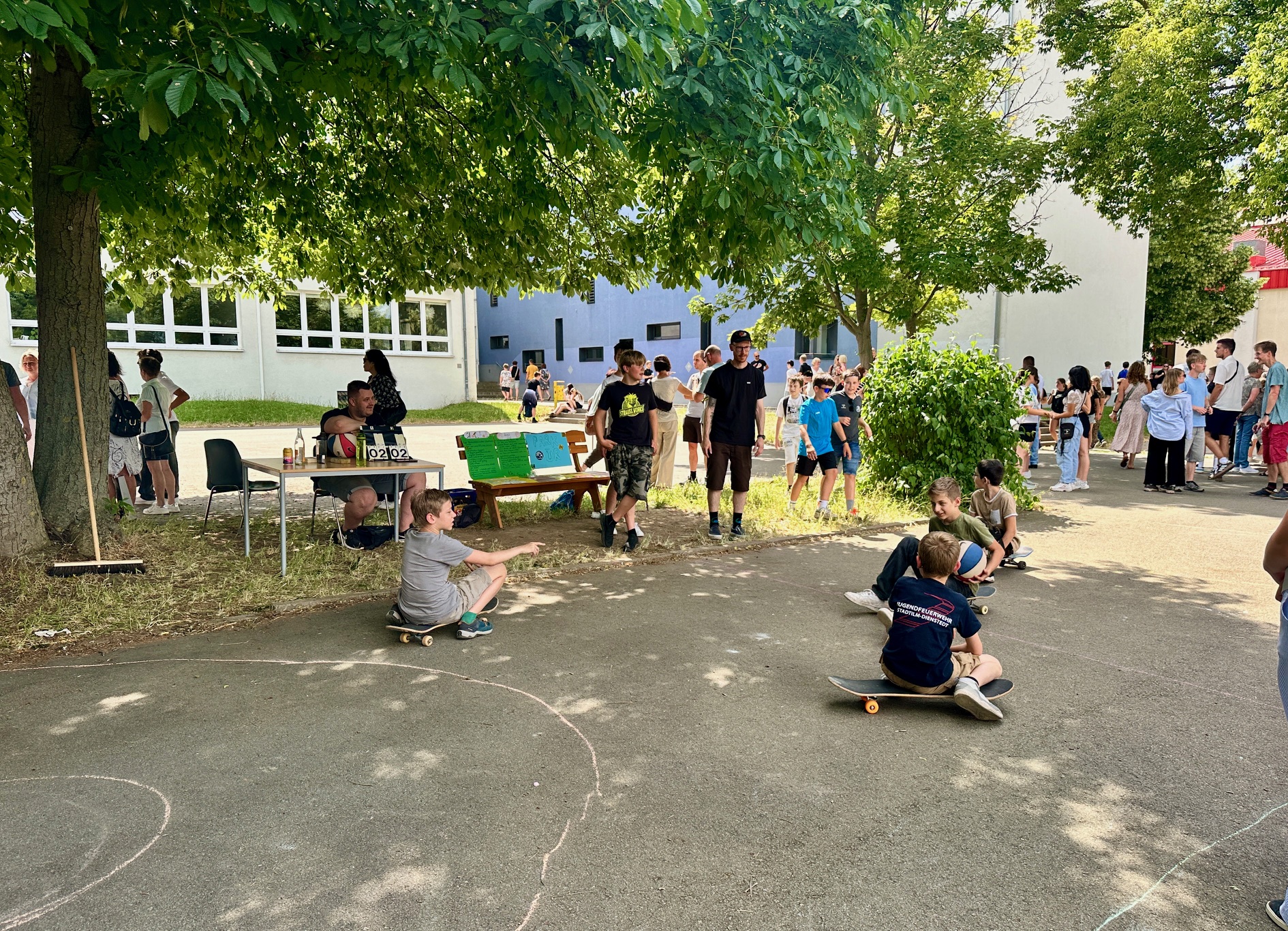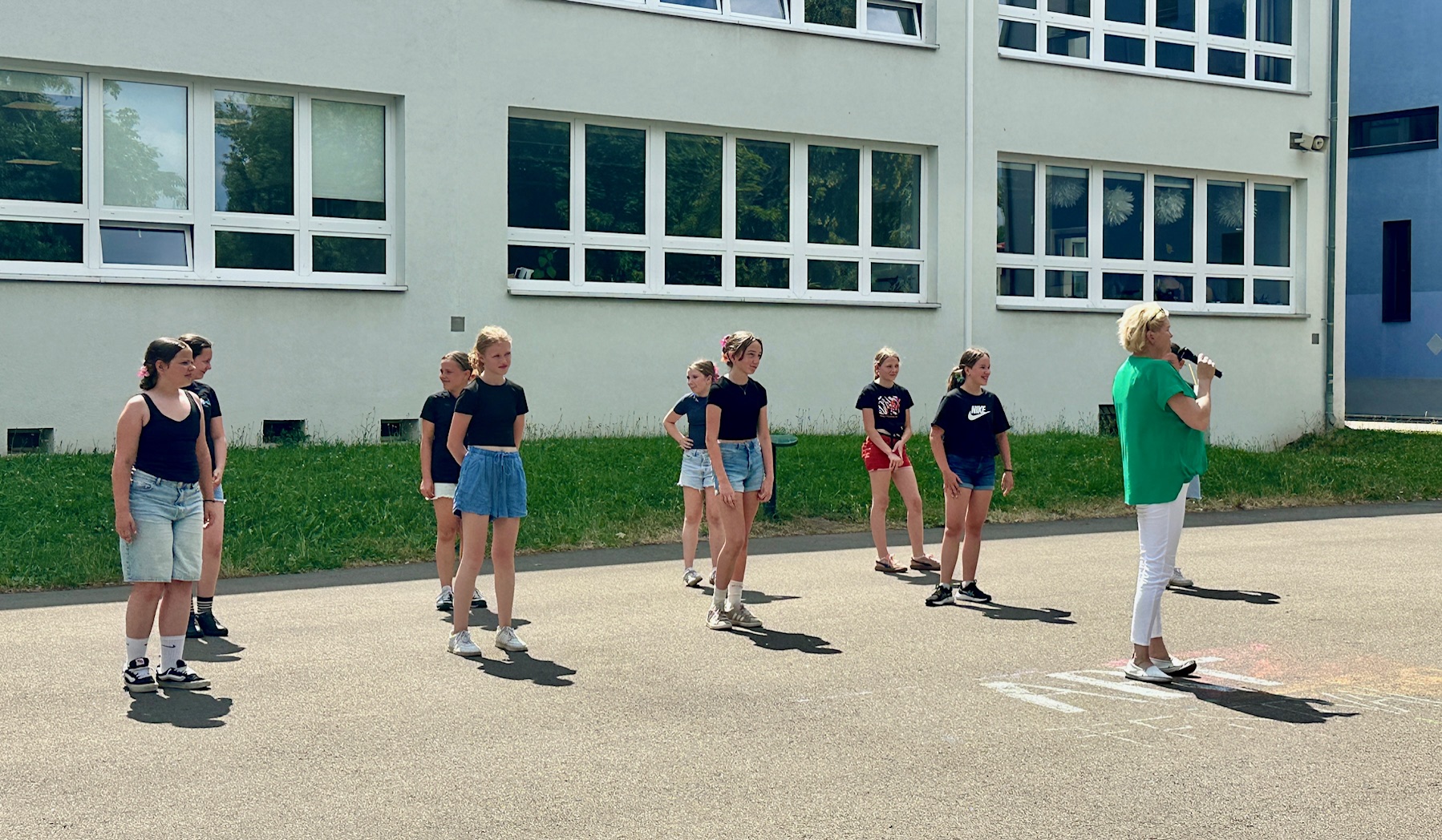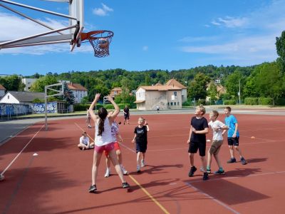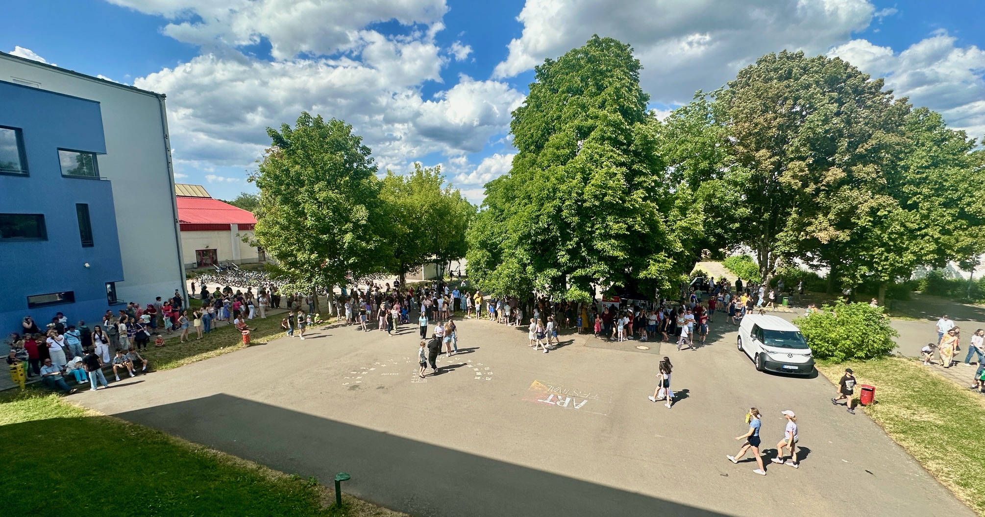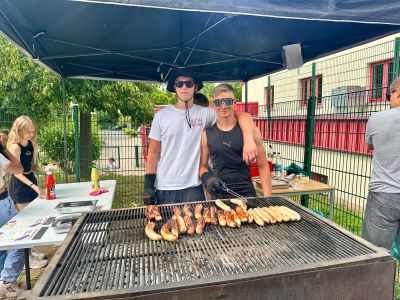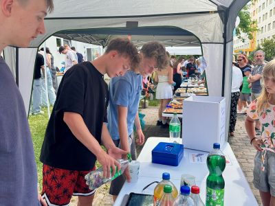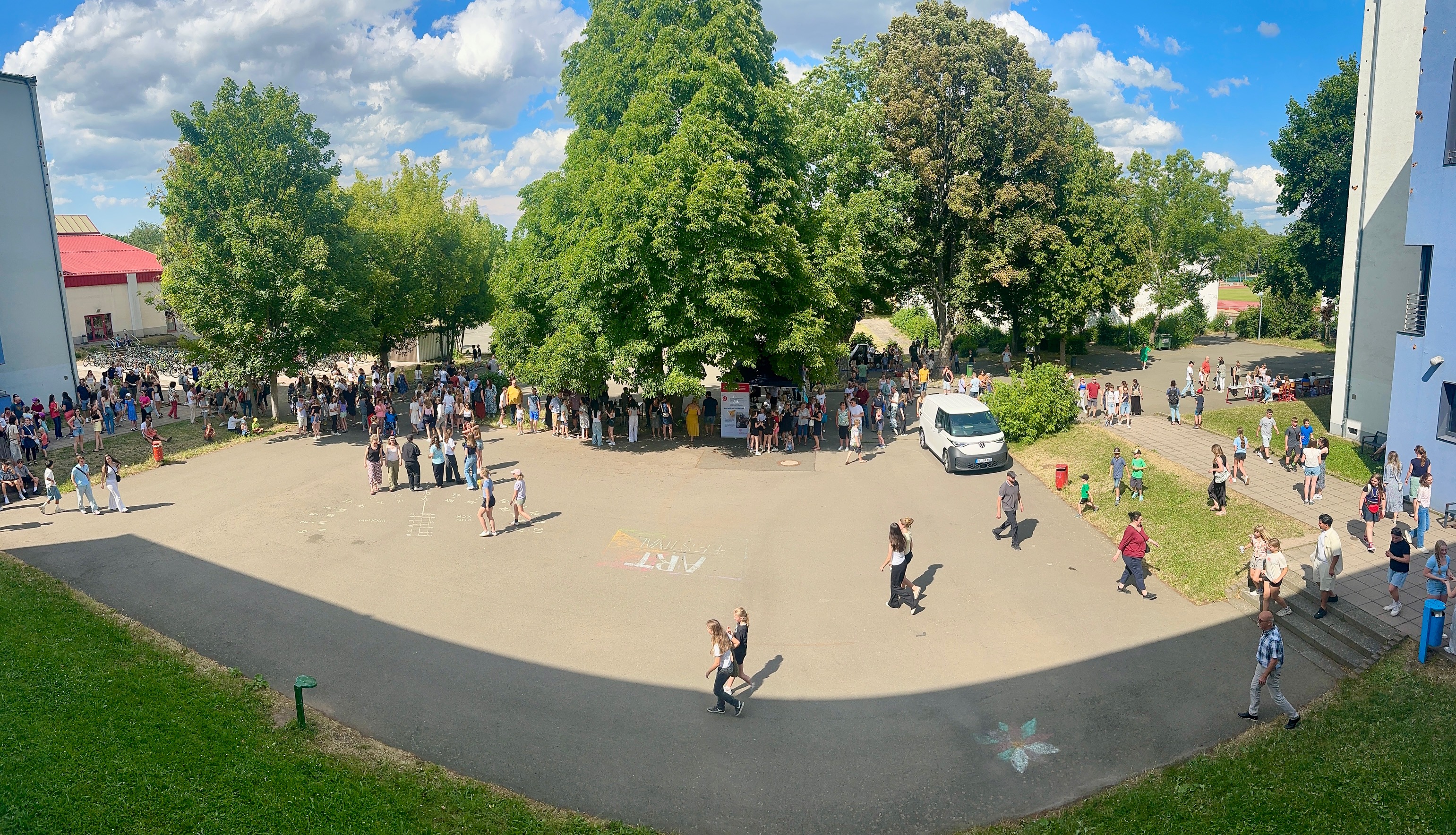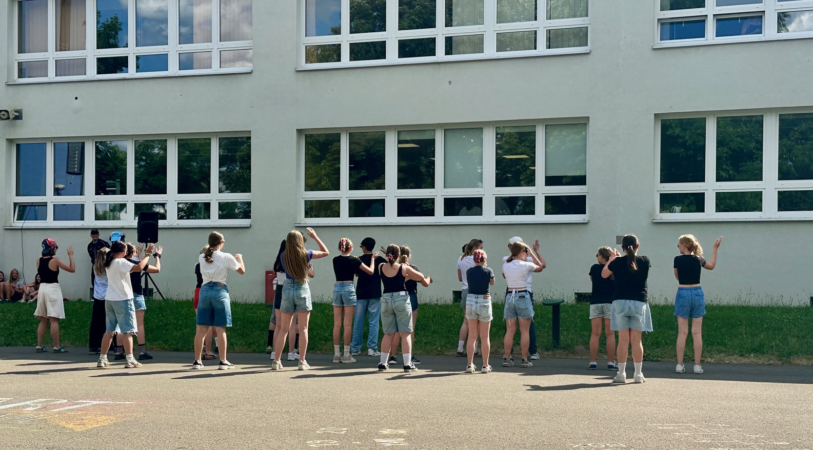 Am Donnerstagnachmittag, dem 26.06.2025 war dann der krönende Abschluss der Projektwoche: das Schulfest. Das Wetter war uns fast die ganze Zeit hold und so wurde der Schulhof zum Treffpunkt für die ganze Schulgemeinschaft. Es gab eine Zumba-Performance, die richtig Stimmung machte, gefolgt von zwei Mitmach-Tanzrunden, bei denen viele Schülerinnen und Schüler spontan mit einstiegen. In der Turnhalle zeigten die Akrobatik-Gruppen ihr Können, es wurden eigene Sagen vorgelesen, und in vielen weiteren Ständen und Räumen im Schulhaus konnte man alle Ergebnisse der Projektwoche bestaunen – von Kunstwerken über Informationsstände bis hin zu kreativen Handarbeiten.