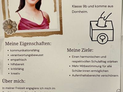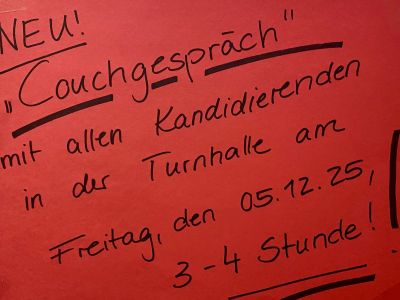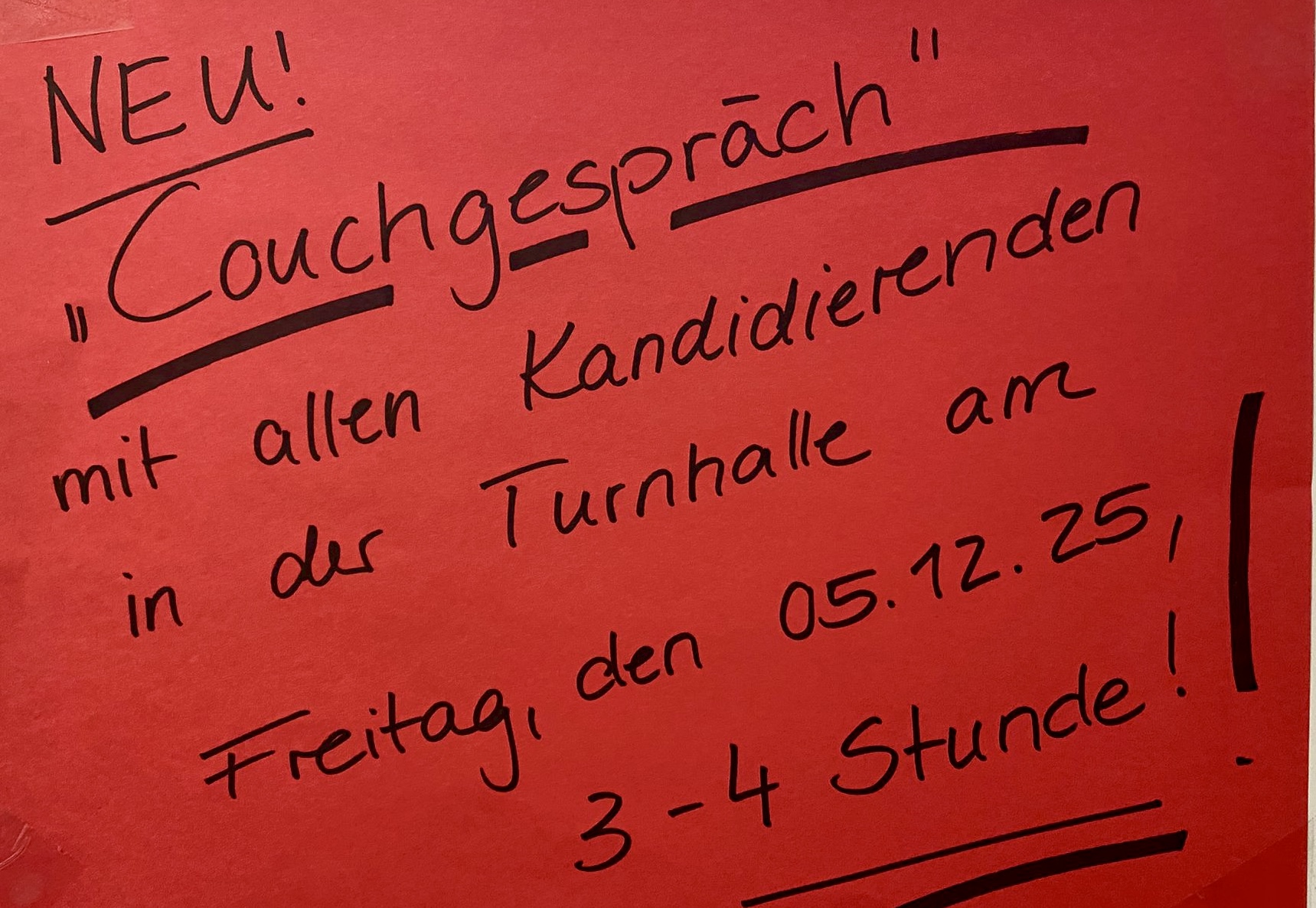 Damit ihr einen Eindruck von den Kandidierenden bekommen könnt, findet am 5.12.2025 in der 3. und 4. Stunde in der Turnhalle ein "Couchgespräch" statt.